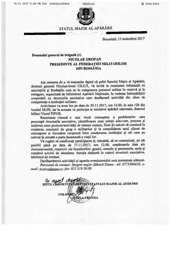 Presedintele ROMIL, col.r Tudor Marian impreuna cu Vicepresedintele col. r. Naon Misu vor participa in ziua de 20.11.2017, la Reuniunea informala cu asociatiile si fundatiile care au in compunere personal militar in rezeva si retragere organizata de MApN, in vederea imbunatatirii cooperarii cu structurile asociative care desfasoara activitati in sfera de competenta a institutiei militare.