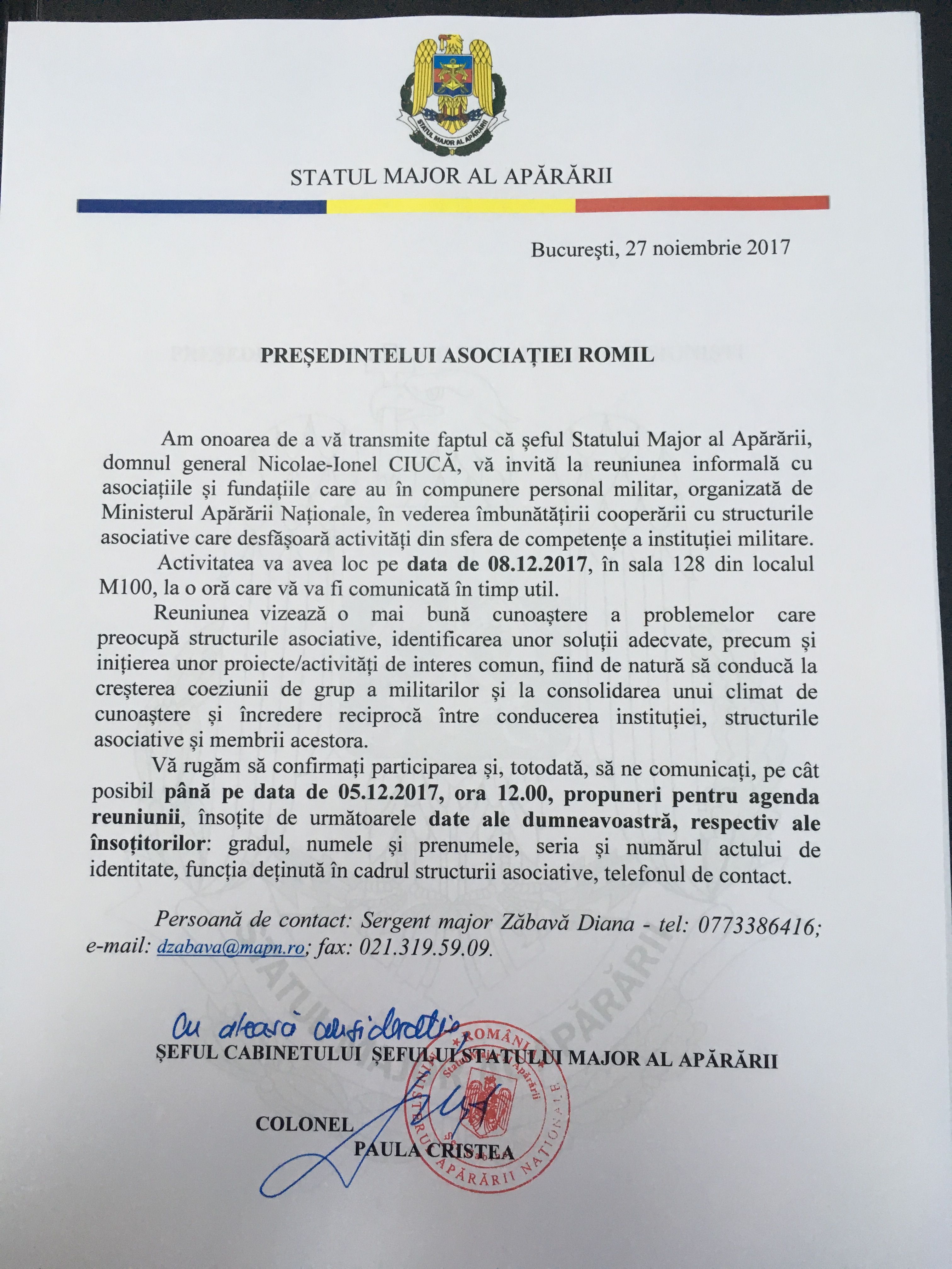 Seful Statului Major al Apararii invita Asociatia ROMIL la reuniunea informala cu asociatiile si fundatiile care au in compunere personal militar, pe data de 08.12.2017